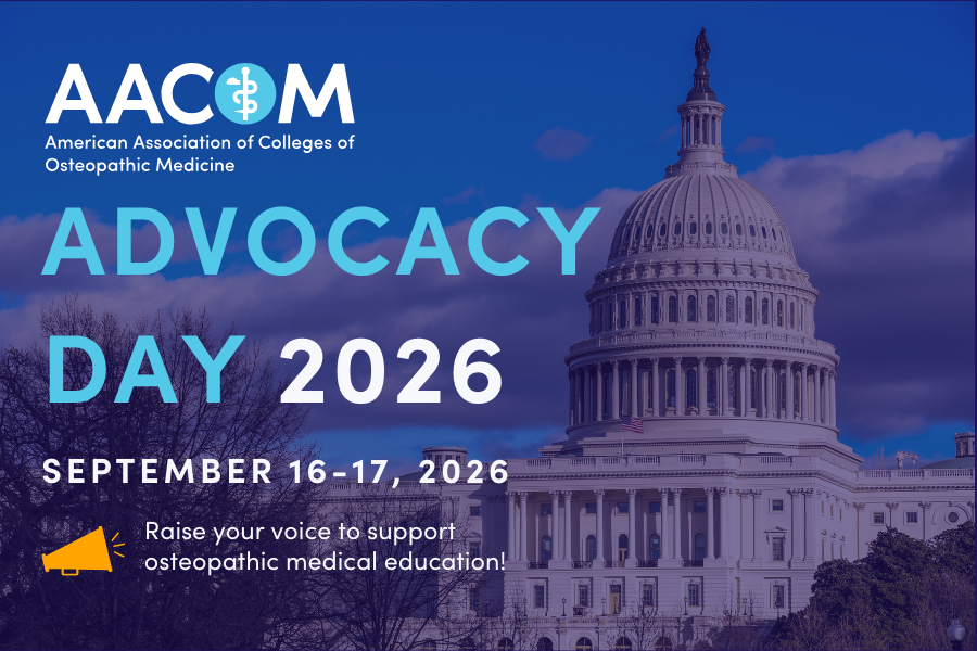 Please join us for AACOM Advocacy Day 2026 on September 16 and 17! Osteopathic deans, students, faculty, and advocates will come together to advocate for osteopathic medical education (OME) federal policy priorities. The event is virtual and open to all members of the OME community.