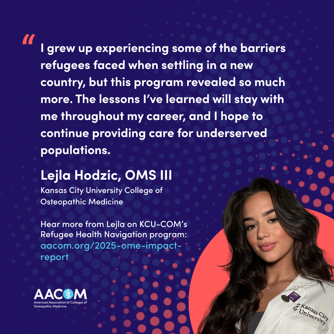 OMS III Lejla Hodzic | KCU-COMLejla is an OMS III at Kansas City University College of Osteopathic Medicine. She is the daughter of Bosnian refugees, who came to the United States in 2000, and one of four children. Growing up, she often served as an advocate for my family, helping her parents navigate language and cultural barriers, which sparked her lifelong passion for advocacy. That passion ultimately led Lejla to cofound the Refugee Health Navigation Program, an initiative very special to her. Her interests in medicine lie in dermatology and oncology, where she hopes to continue combining clinical care with service to underserved communities. In her free time, she enjoys playing soccer, cooking and going on long nature walks.