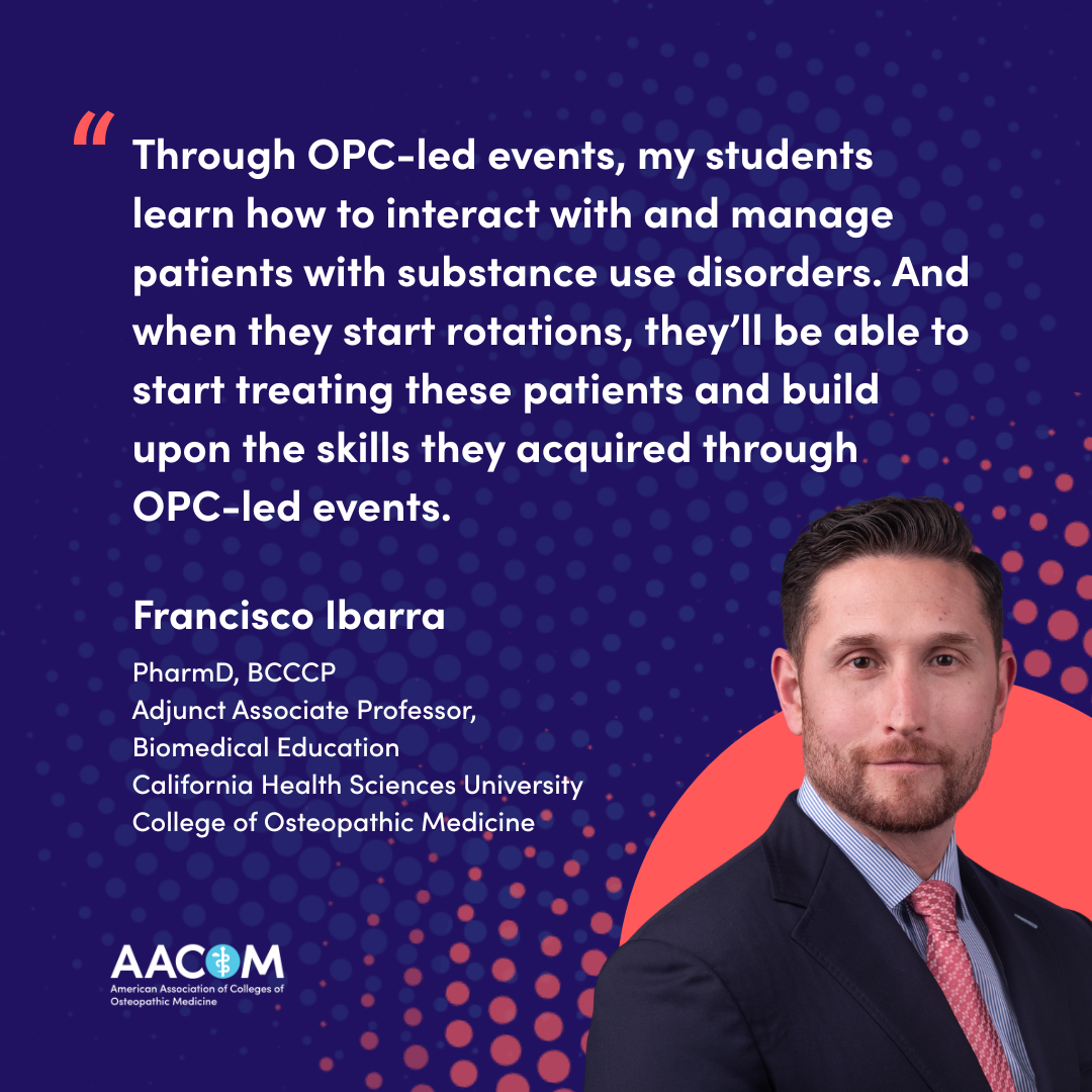As OPC evolves, Dr. Ibarra hopes to expand the services they’re able to offer and better prepare his students for managing patients with substance use disorders, sharing, “through OPC-led events, my students learn how to interact with and manage patients with substance use disorders. And when they start rotations, they’ll be able to start treating these patients and build upon the skills they acquired through OPC-led events.”