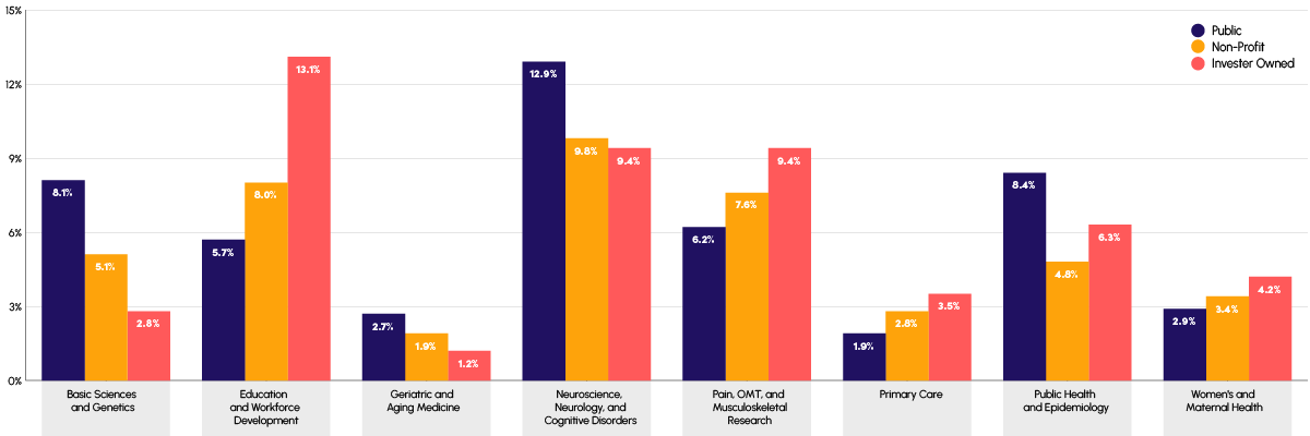 University-affiliated COMs show greater representation in biomedical and laboratory-oriented domains, while other COM types demonstrate relatively stronger representation in clinically oriented or educational research areas.