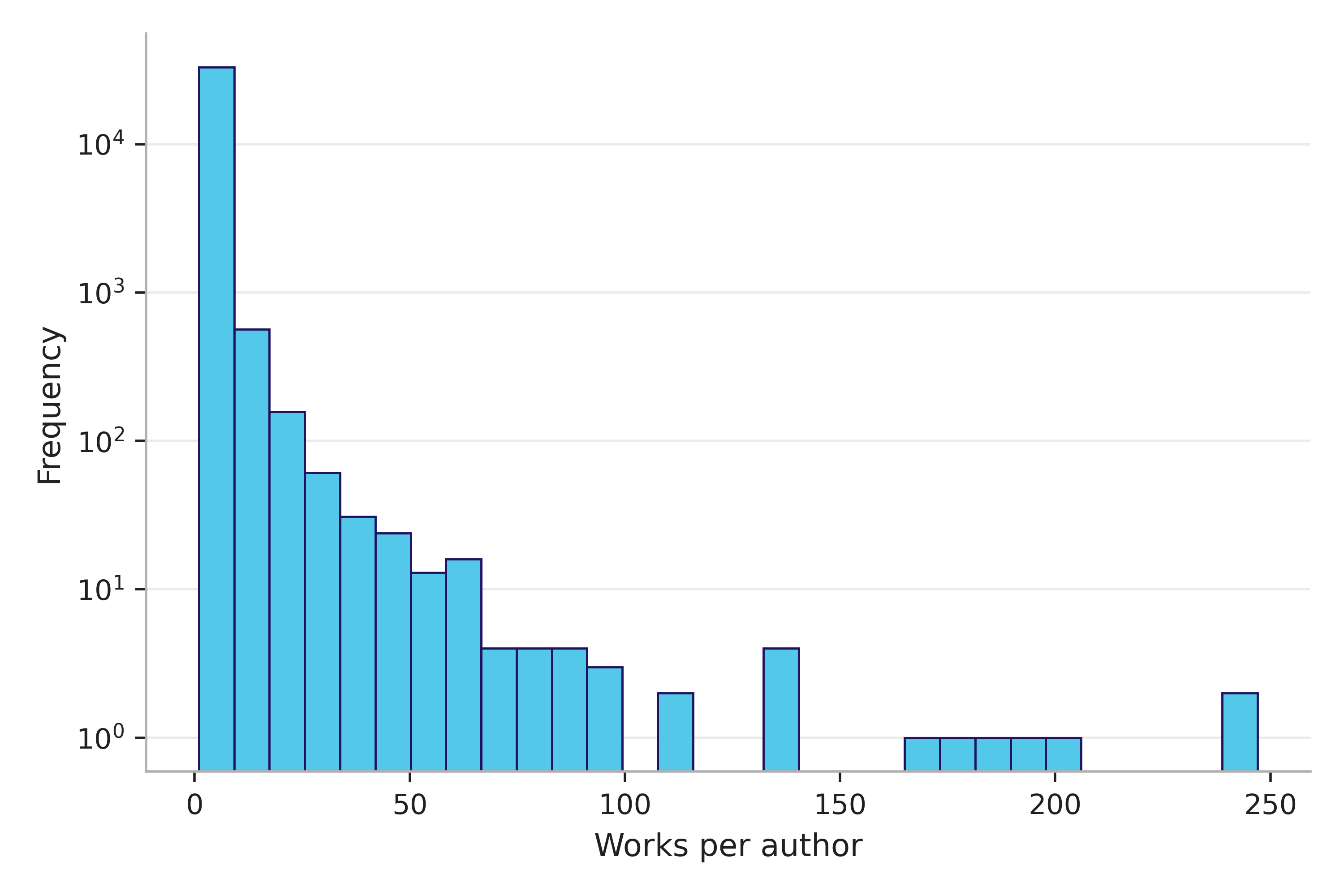 While nearly 70 percent of authors in the corpus appear on exactly one work, fewer than three percent of authors appear on 10 or more works.