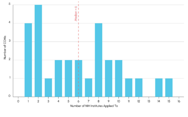 National Institute on Aging received the largest number of applications (114) from 17 COMs, followed by the National Institute of Allergy and Infectious Diseases (99 applications across 15 COMs) and the National Cancer Institute (94 across 18 COMs).