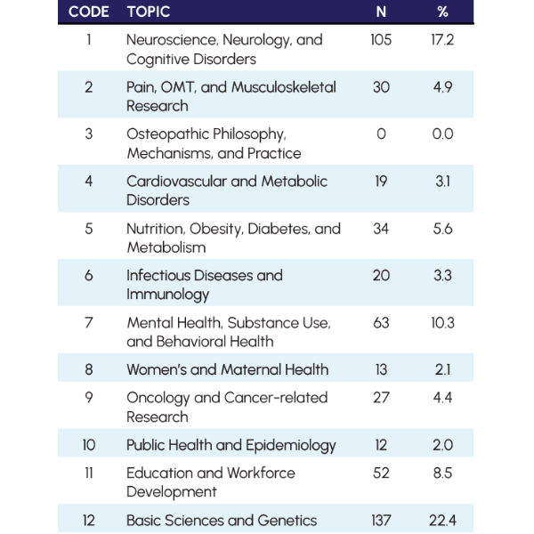 COM-affiliated research represents a distinct pipeline for scientific inquiry that both aligns with national health priorities and draws upon values of osteopathic medicine: holistic approach to medicine, community-engaged care in rural and underserved areas and strong presence in primary care.