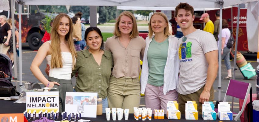 Members of the Dermatology Interest Group at the Idaho College of Osteopathic Medicine (ICOM) educated community members about the importance of sun and skin care at a local farmer's market. The future physicians offered attendees free sunscreen, water and educational materials about skin cancer and prevention.
