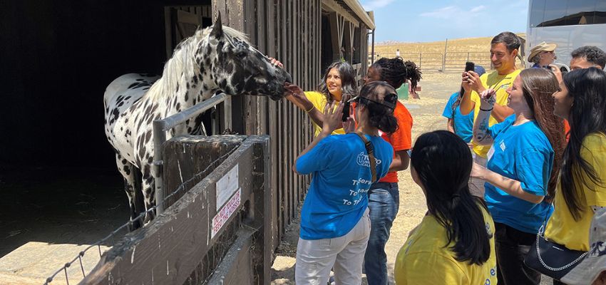 Photo: Students entering TUCOM for the 2024-2025 academic year stop to pet a horse during a Day of Service workday at Rush Ranch in the Suisun Marsh.
