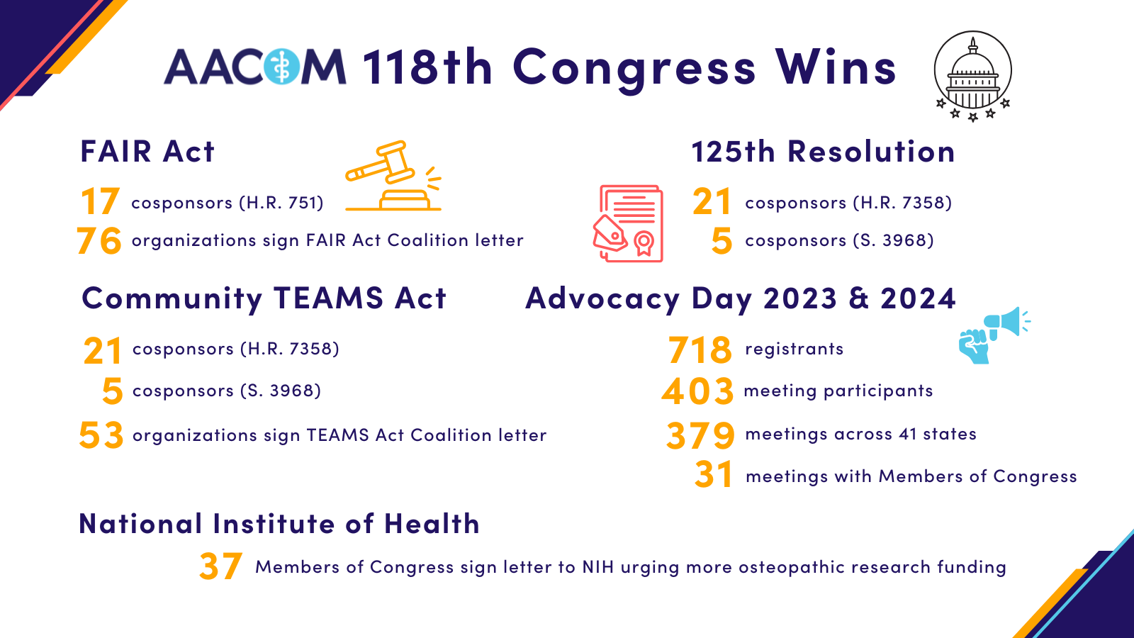 AACOM achieved significant successes for osteopathic medical education (OME) during the 118th Congress. - The growth in congressional support for the bipartisan Fair Access In Residency Act, H.R. 751, and the increase to 76 supporting national and state healthcare organizations, demonstrated significant progress toward ensuring graduate medical education (GME) parity for osteopathic graduates in the residency selection process.