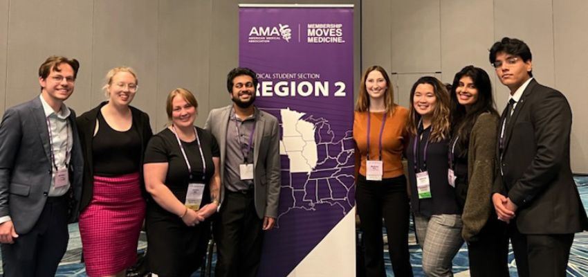 Nine osteopathic medical students from the Des Moines University College of Osteopathic Medicine (DMUCOM) represented the university at the American Medical Association (AMA) Interim Meeting of the House of Delegates 2024 in Orlando, Florida, in November 2024. The AMA represents physicians with a unified voice in courts and legislative bodies across the nation, advocating for patient care and training the health care leaders of tomorrow.