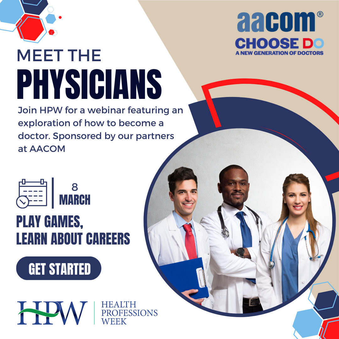 Hosted by the American Association of Colleges of Osteopathic Medicine (AACOM), Health Professions Week's Meet the Physicians – an exploration of how to become a doctor webinar will focus on identifying the steps all future physicians take to pursue their top choice residency program. Meet physicians, both DO and MD, who will discuss their path to Obstetrics/Gynecologist, Psychiatry, Emergency, Internal Medicine and many more!